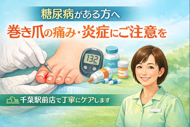 糖尿病がある方は、巻き爪による痛みが重症化しやすいため注意が必要です。本記事では、糖尿病と巻き爪の関係、矯正時の注意点、千葉駅前店での対応について詳しく解説します。若葉区など周辺地域で巻き爪や痛みに悩む糖尿病の方にも役立つ内容です。