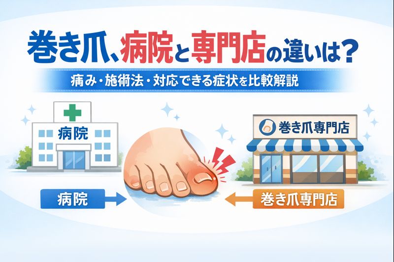 巻き爪の痛みで悩んだとき、病院と専門店の違いが分からず迷う方は多いものです。本記事では、千葉駅前店の視点から、保険の有無を中心とした両者の違いや、矯正時の痛みの考え方を解説します。病院で改善しなかった巻き爪や陥入爪に悩む方にも役立つ内容です。