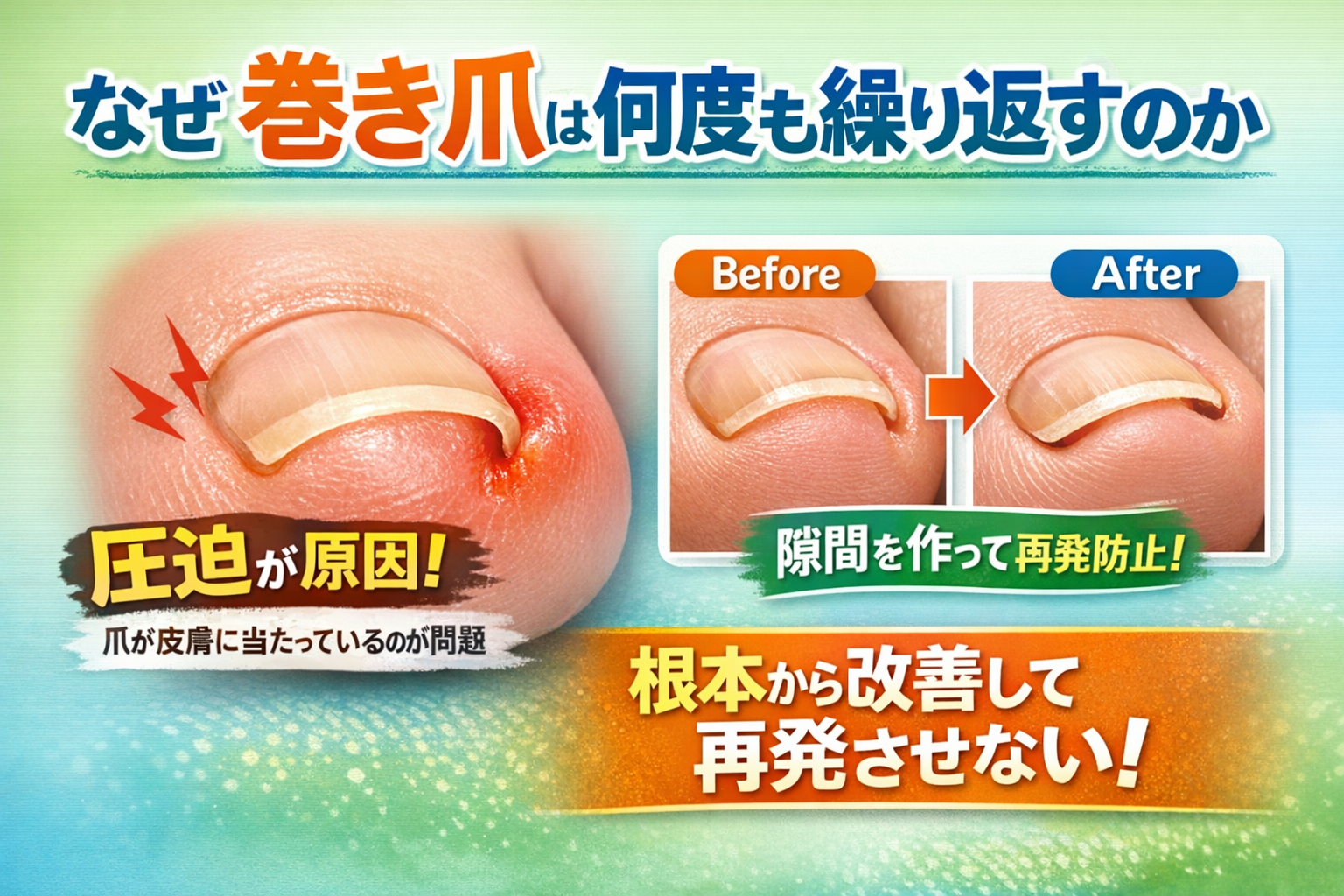 その理由は、巻き爪の“本当の原因”に対して適切な処置がされていないことにあります。