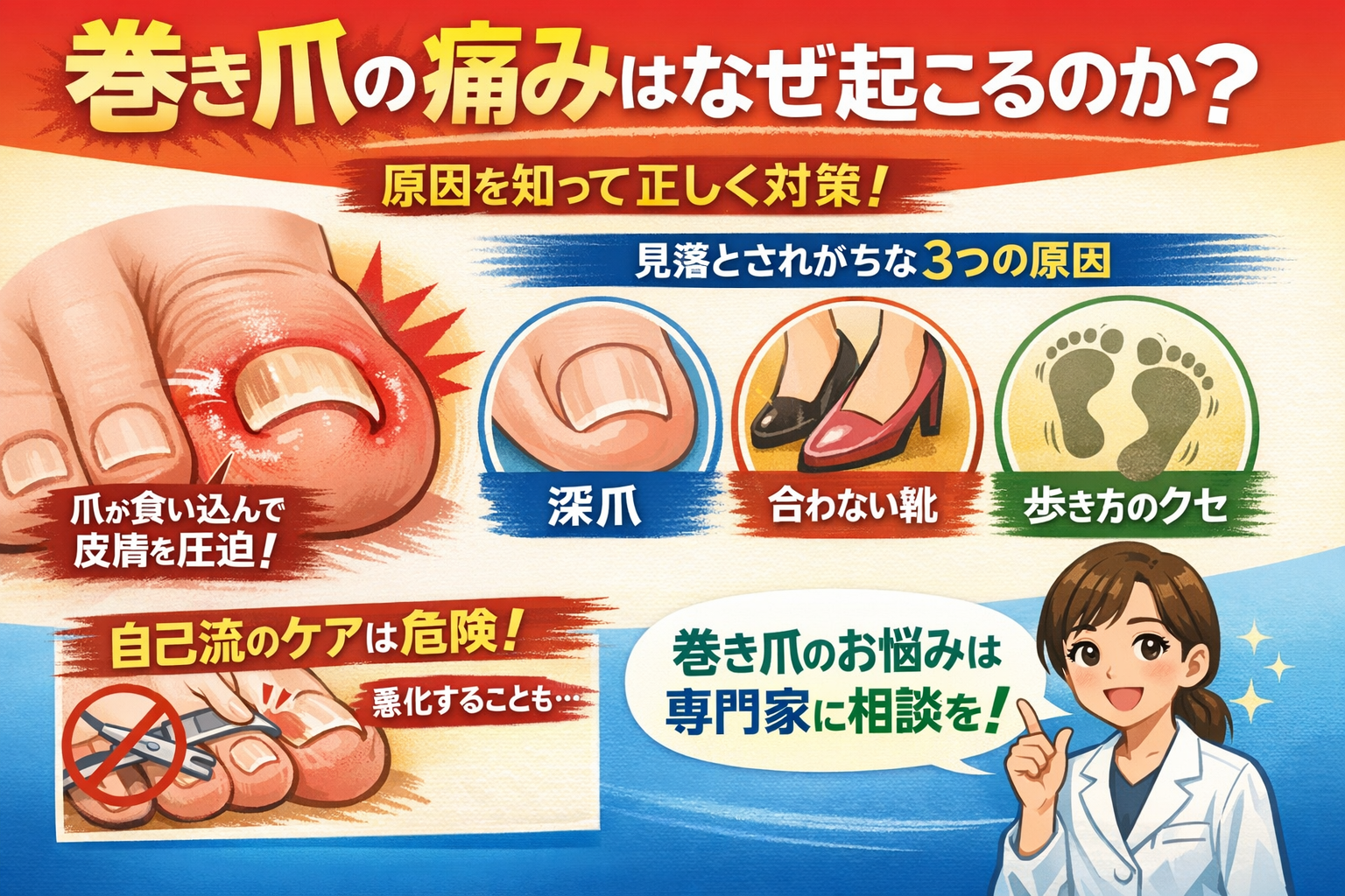 巻き爪の痛みはなぜ起こるのかご存じですか?実は「爪の形」だけが原因ではなく、日常生活の中にある習慣や足への負担が大きく関係しています。本記事では、巻き爪が痛くなる本当の原因と、悪化させないためのポイントについてわかりやすく解説します。千葉駅周辺で巻き爪にお悩みの方はぜひ参考にしてください。