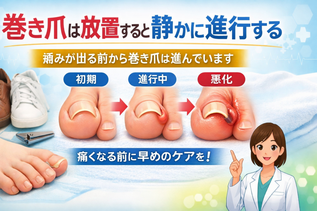 著者:巻き爪じゅん 木原一真 巻き爪は痛みが出てから対処すれば良いと思われがちですが、放置すると爪と皮膚の関係が変化し悪化しやすくなります。本記事では巻き爪じゅん千葉駅前店が、巻き爪を放置した場合に起きる爪と皮膚の段階的変化、悪化のメカニ...